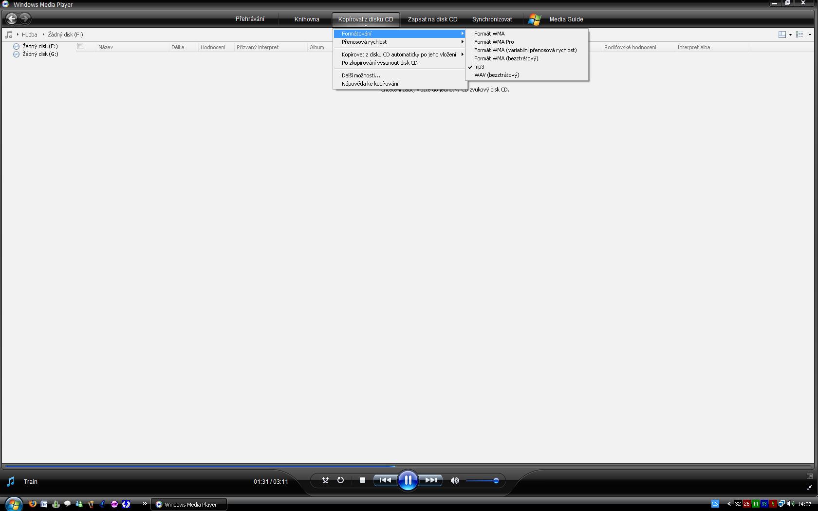 Formátování: Předtím, než začneme kopírovat, máme možnost nastavit si formát, ve kterém se nám hudba zkopíruje.